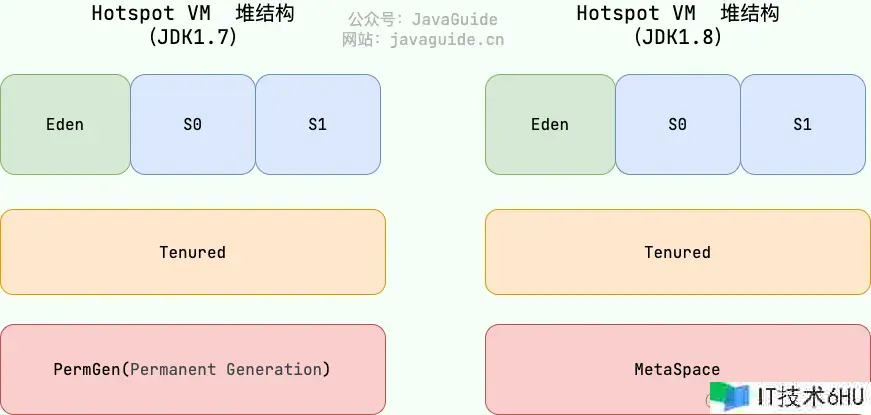 在JDK7及曾经,堆内存一般被分为3部分:新生代内存、老生代、永久代。 JDK 8 版本之后 PermGen(永久代) 已被 Metaspace(元空间) 替代,元空间运用的是本地内存。 (我会在办法区这部分内容详细介绍到)。