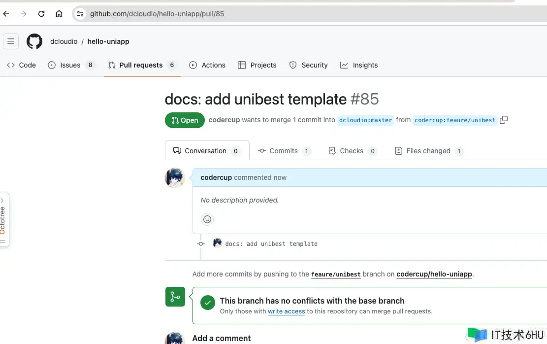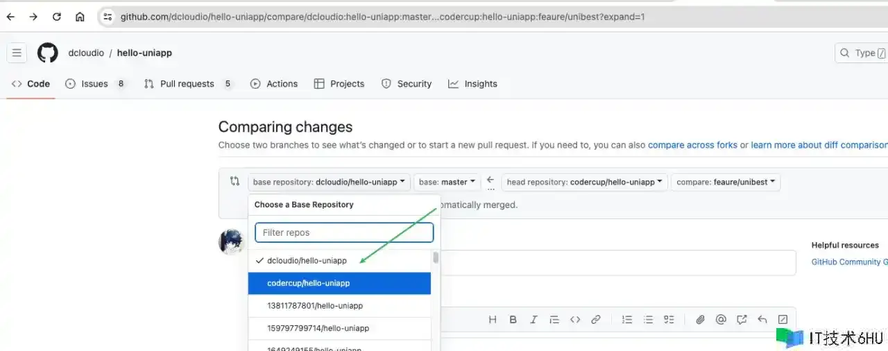 支撑 切换merge 到的库房(这儿不用切换,咱们便是要给 dcloudio/hello-uniappPR)