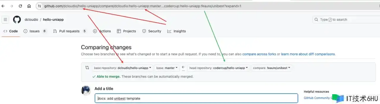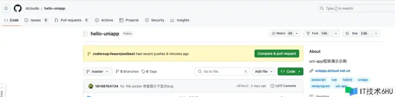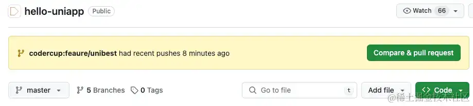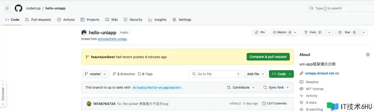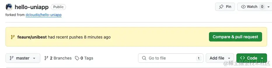 网址为:https://github.com/dcloudio/hello-uniapp/compare/dcloudio:hello-uniapp:master...codercup:hello-uniapp:feaure/unibest?expand=1