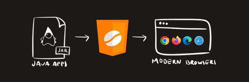 文档中将CheerpJ 3.0描绘为一个在浏览器中编译Java字节码为JavaScript的WebAssemblyJava虚拟机(如上所述),其组件包括: