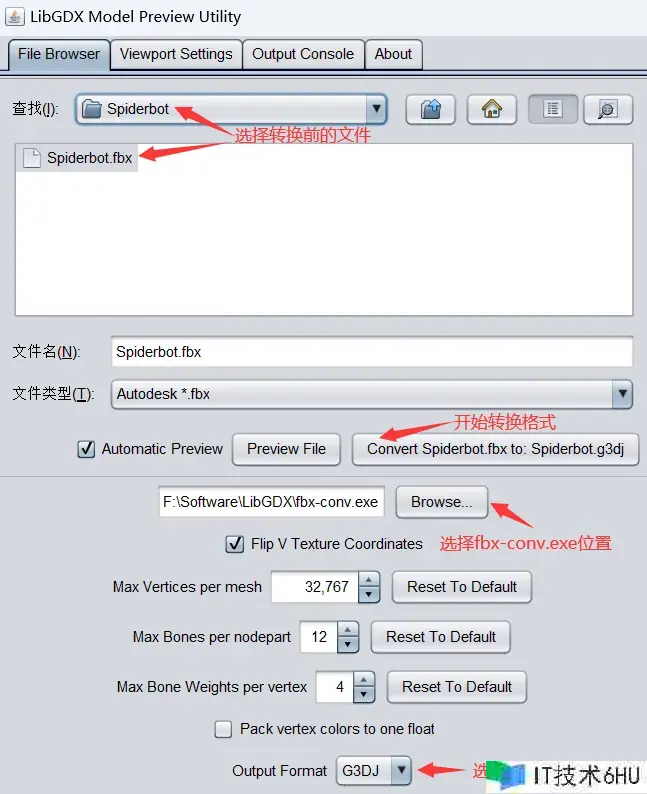 双击 fbxconv-gui.jar 文件翻开 libGDX 模型预览东西窗口,按以下配置转化模型格局。