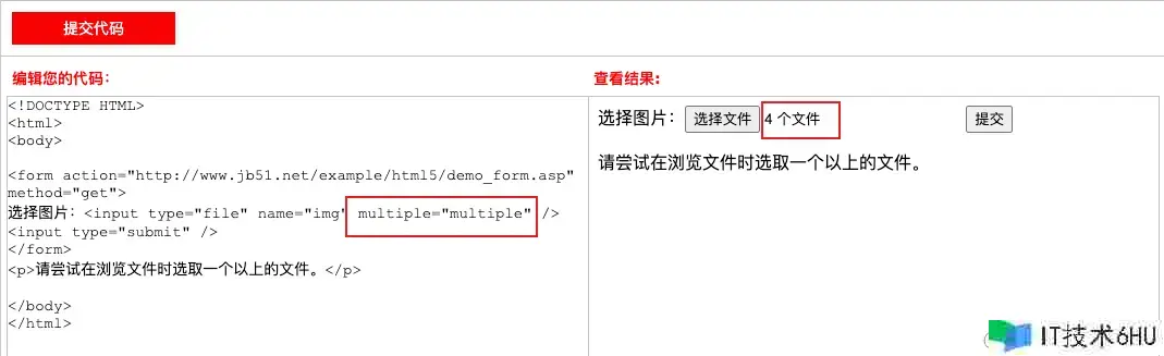 在多数状况下,multiple 特点常用于文件上传的输入框中,以答运用户一起挑选多个文件进行上传。