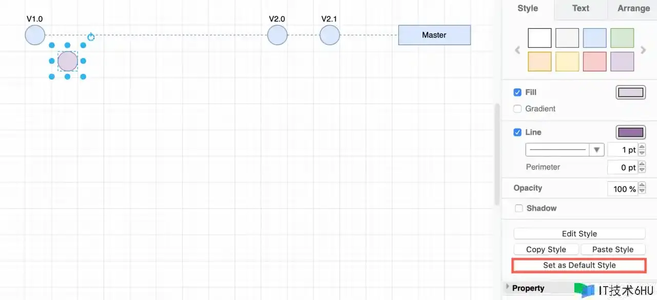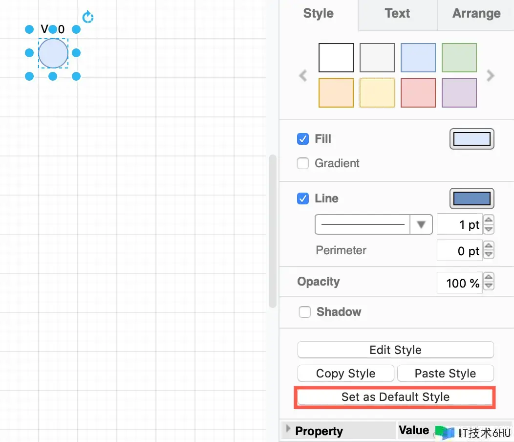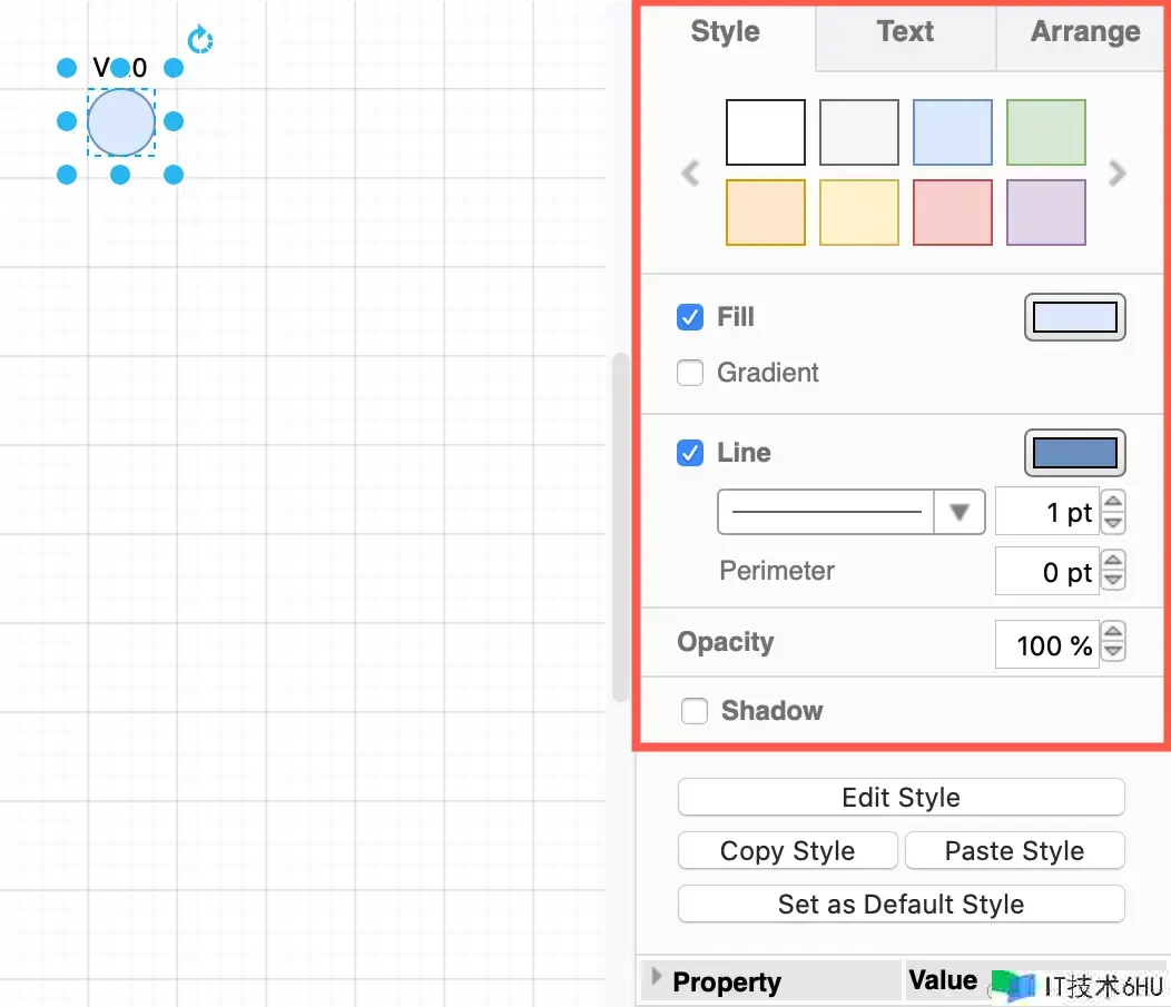 在绘图画布上添加一个圆圈。通过在圆圈的边界框周围单击并拖动手柄来调整其巨细。假如你愿意,能够在格局面板的Style选项卡中设置色彩和款式。