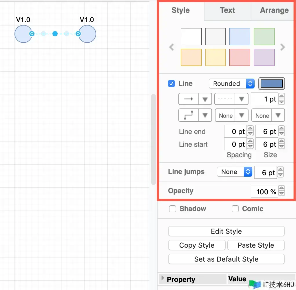 挑选两个图形之间的衔接线,并在格局面板的style选项卡中设置其款式。
