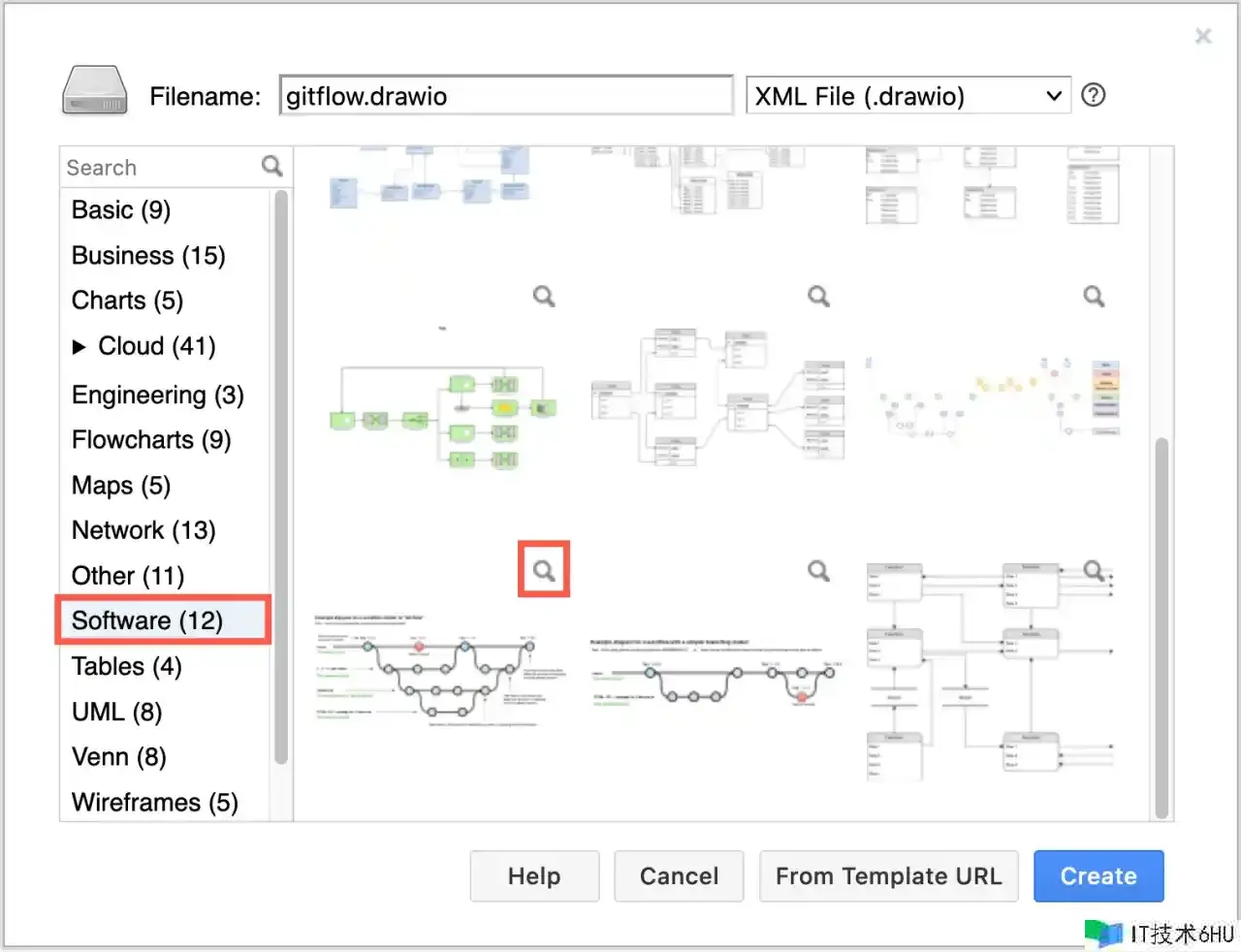 挑选其间一个gitflow图表模板,然后单击Insert或Create将该模板仿制到图表画布中。