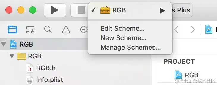 - 点击 Xcode 左上方的 scheme,挑选 “Manage Schemes”。咱们需求将咱们的计划标记为 “同享”,这样该项目就能够用 Carthage 来构建。