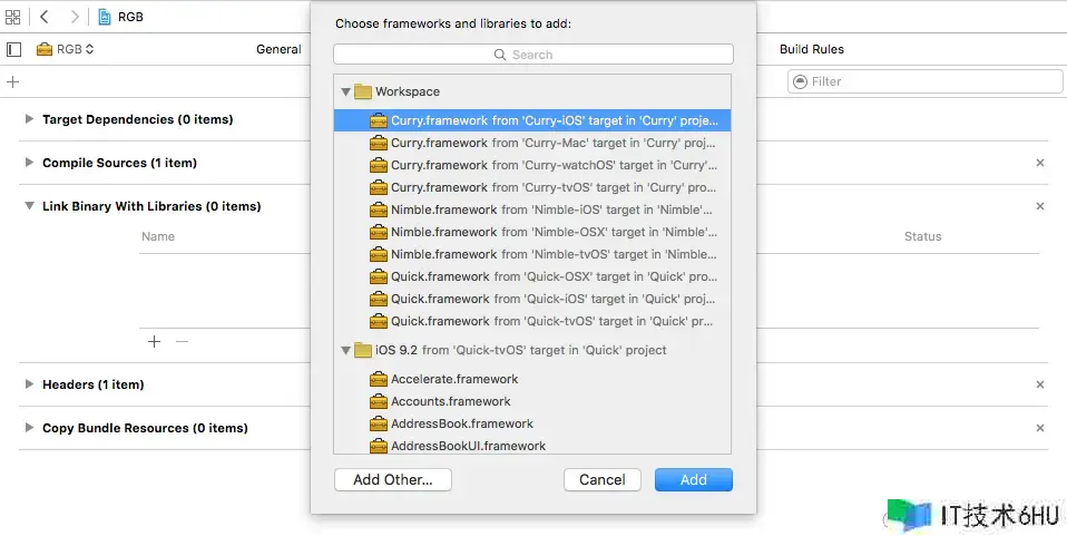 - 点击 “+” 图标,挑选 Curry-iOS 方针中的 Curry.framework。