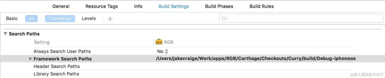 - 当增加依靠联系到每个方针时,Xcode 将主动把它们增加到 “构建设置” 标签下的 “结构查找途径” 中。咱们能够从 “RGB” 和 “RGBTests” 方针中删除这些,由于 Xcode 将它们视为隐含的依靠联系,由于它们在同一个作业区。