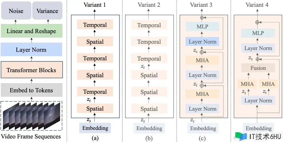 - 变体4:变体4将多头留意力(MHA)分化为两个组件,利用不同的组件别离处理空间和时刻维度上的令牌。在Transformer骨干结构之后,经过采用规范线性解码器以及重塑操作,对视频令牌序列进行解码,然后得出预测噪声和预测协方差。。