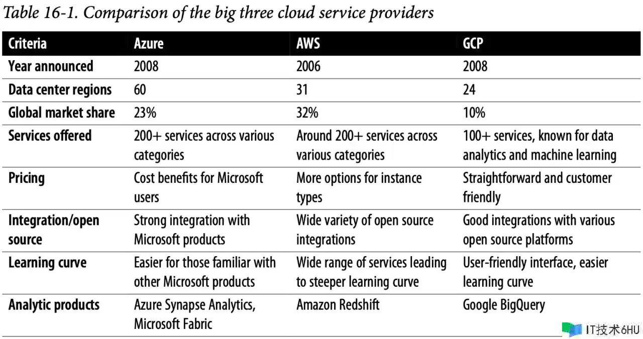 三大首要的云服务供给商,微软Azure、亚马逊网络服务(AWS)和谷歌云渠道(GCP),占有了大部分商场份额(据估计在2023年第二季度为65%)。要获取有关每个供给商的最新详细信息,请拜访它们各自的网站。表16-1比较了它们的首要特点,为您供给了全面的概述。