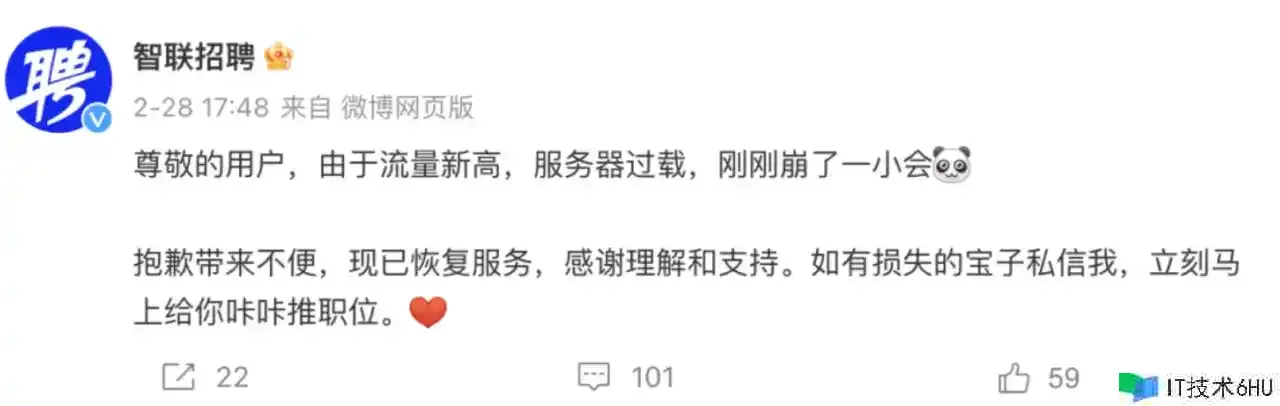 2月28日晚,“智联招聘崩了”突然冲上热搜,智联招聘官方微博紧迫发声,点明原因是“流量新高,服务器过载”。用户们纷繁在社交渠道发言,认领归于自己的“一份奉献”。