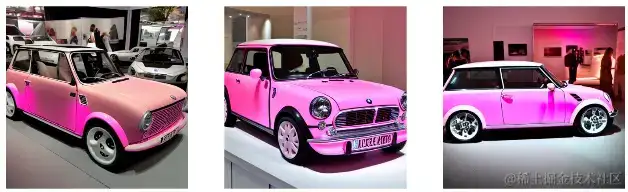 我这儿的提示词是“There is a pink BMW Mini at the exhibition where the lights focus” ,生成 3 张图画,耗时 10.32 s