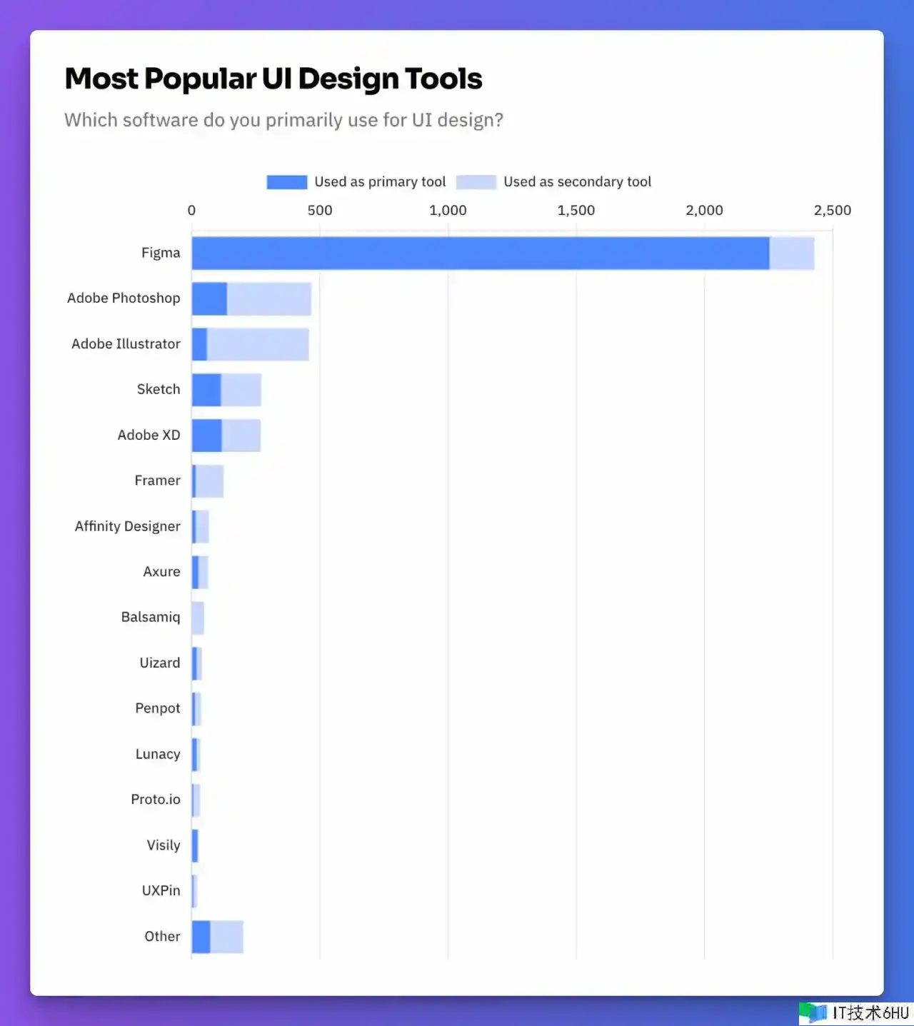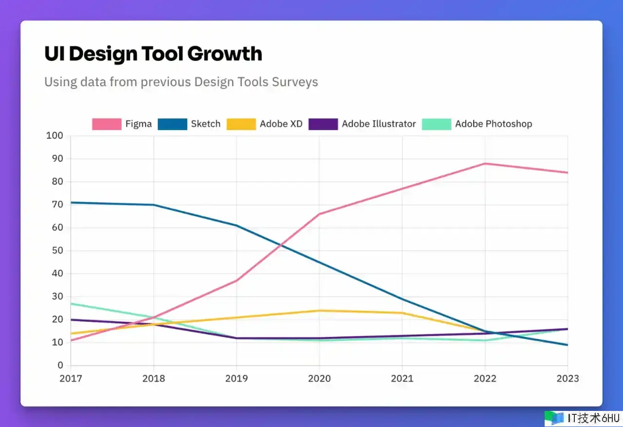 之所以选 Figma 这个赛道,是由于这个途径属于上升期,根据 uxtools 这个网站的调研成果显现,Figma 途径从 2018 年开端,就像是开了挂一下,商场占有率逐步把其他 UX 东西甩在了后边,其间被打得最惨的便是 Sketch