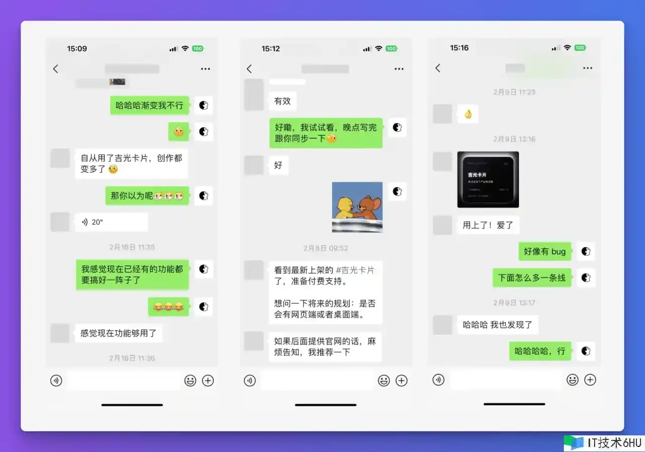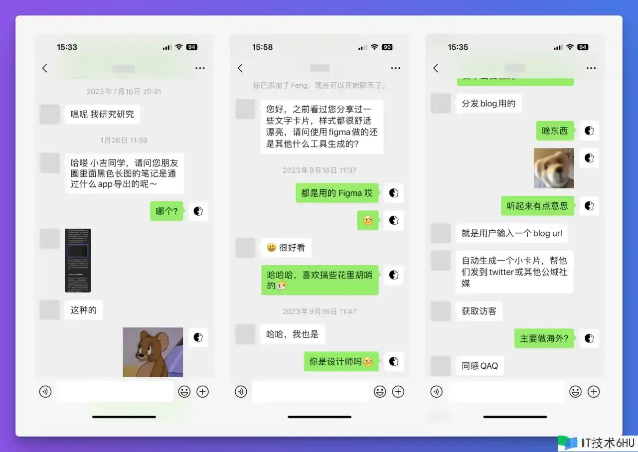 有了这个阅历后,做吉光卡片就比较顺了,在吉光卡片仍是 idea 的时分,我就开端搜集用户的需求,并测验找那些让用户有付费志愿的功用点。为了验证我的主意,我先用 Figma 把产品终究完成的作用做出来,有一些用户看到我的图,会加到我跟我聊天。