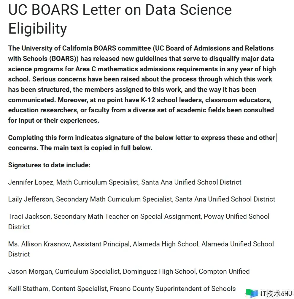 因而,数十名高中数学教师和管理者现已采取举动,他们签署了一封公开信,并将发送给加州大学董事会。该信重申了对数据科学和统计学课程的支撑,批评了 BOARS 下决定时没有咨询高中教师和数据科学专家们的观点。