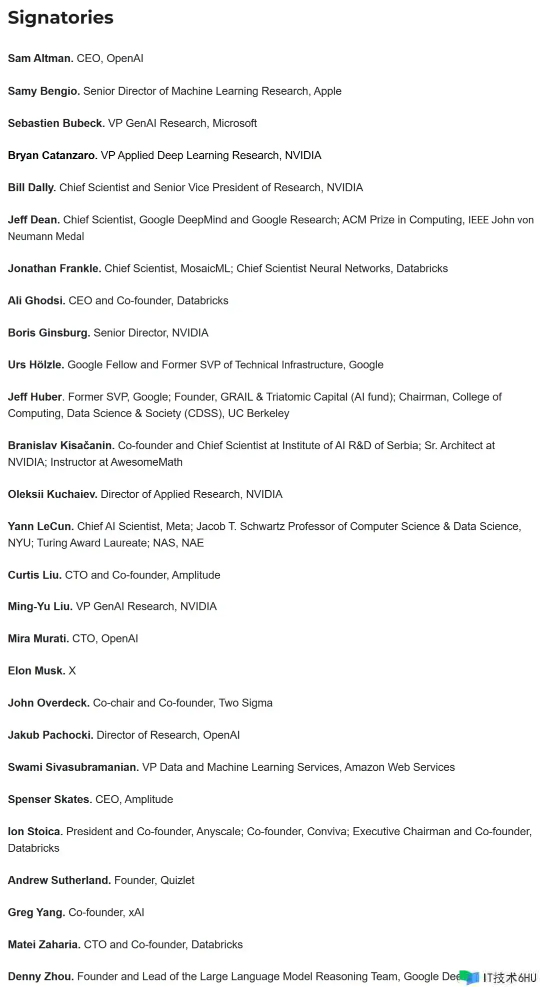 除此之外,支撑此建议的学界和业界重要人物还包括苹果机器学习高管 Samy Bengio、微软生成人工智能副总裁 Sbastien Bubeck、英伟达首席科学家 Bill Dally、谷歌首席科学家 Jeff Dean、图灵奖获得者,Meta 首席科学家 Yann LeCun、xAI 联合创始人 Greg Yang 等人。