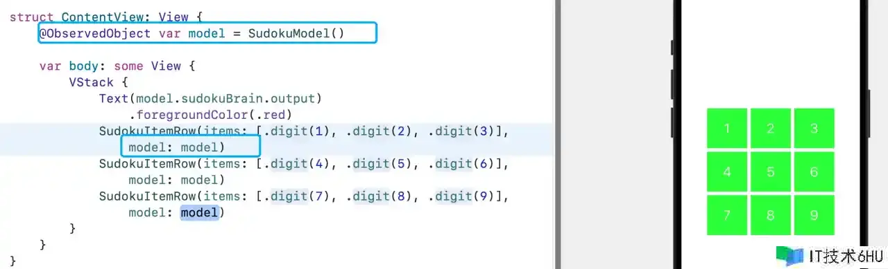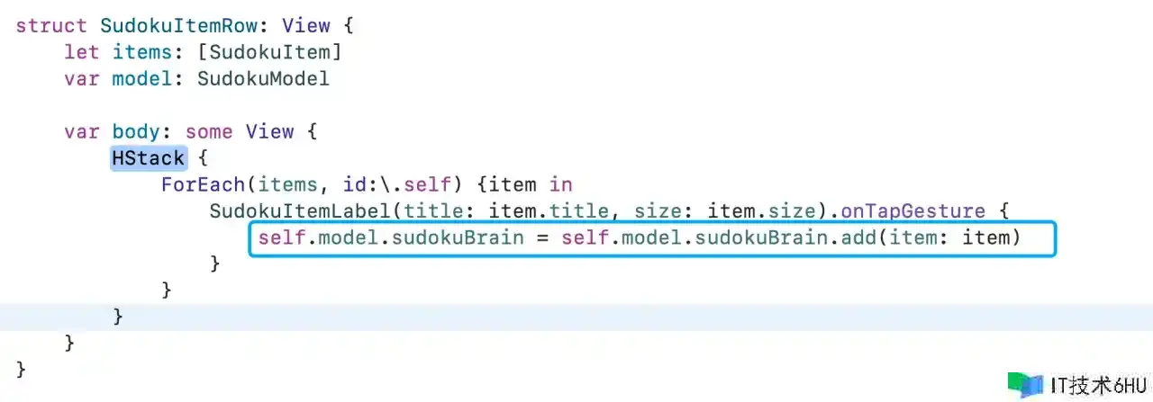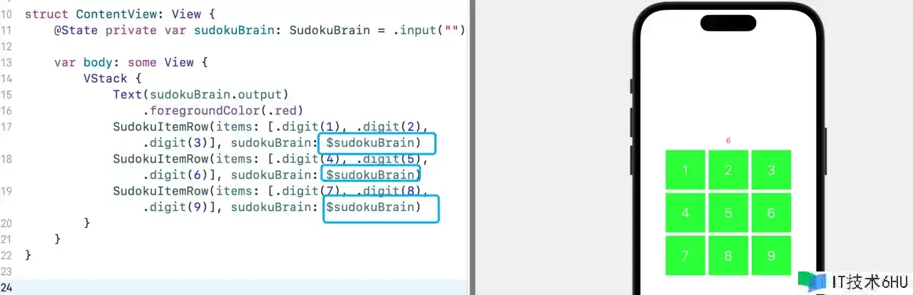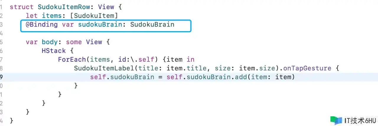 如蓝色框中所示,咱们在SudokuItemRow 中修改Brain就能够上溯到上级UI,来更新整个UI,有点类似C中的指针传递