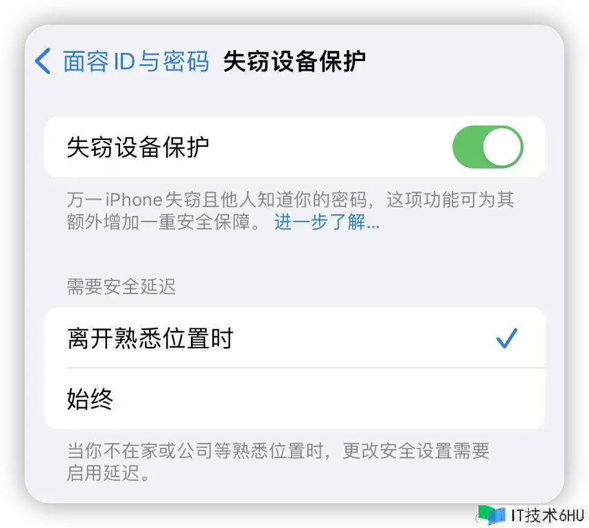 苹果在 iOS 17.3 中添加了「失窃设备维护」功用,此次更新该功用进一步优化,新增了「需求安全推迟」设置选项,能够挑选在「脱离了解方位时」再敞开「失窃设备维护」功用。