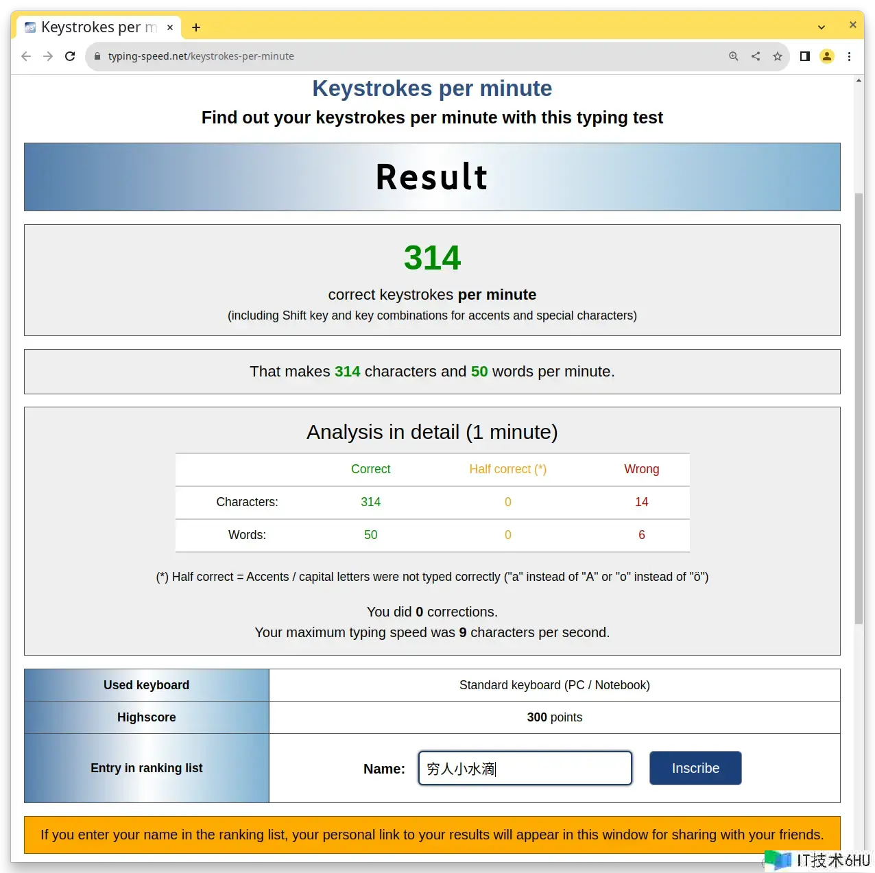 这是窝随手做的一个击键速度测验 (英文), 最高击键速度每秒 9 次, 每分钟 314 次 (均匀 5.2 次/秒).