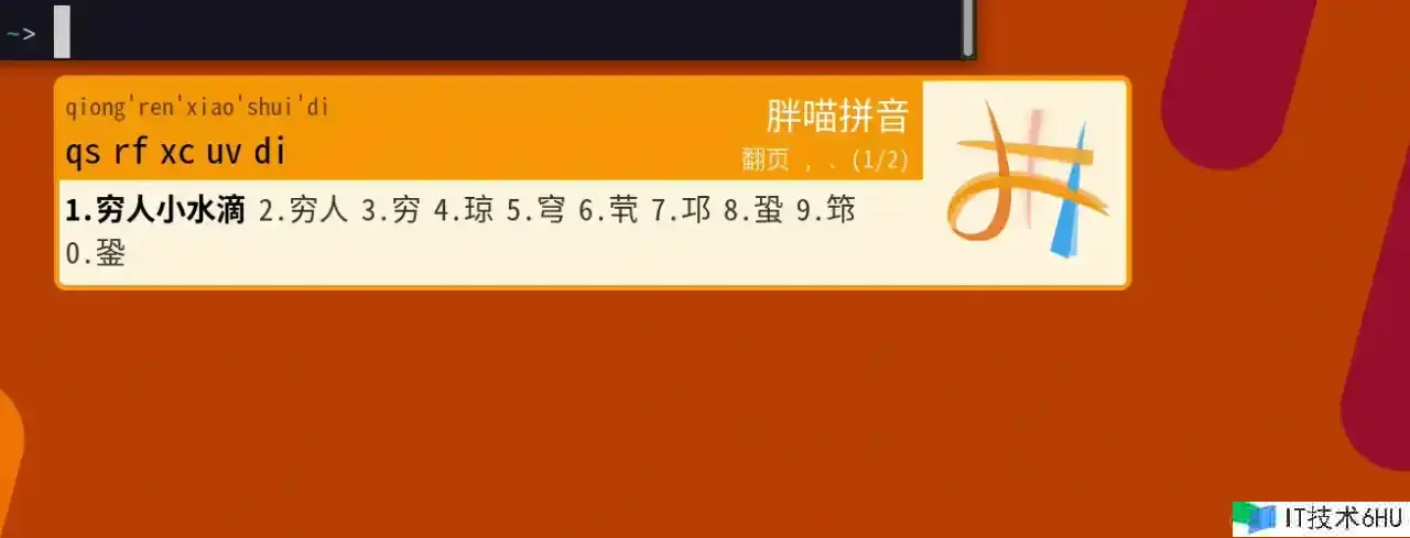 中间显现原始输入 (双拼), 上方显现对应的全拼. 下方显现候选项, 每页 10 个, 按 1 ~ 0 数字键输入对应的候选项. 右侧显现有候选项的页码, 总页数. 按 , . 键翻页. 空格键输入第一个候选项. Esc 键撤销输入.