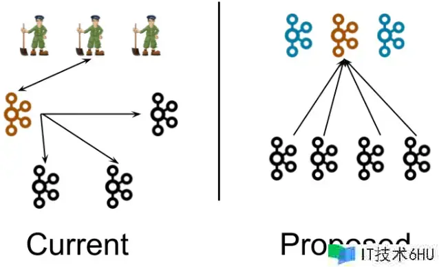 首要来看一下KRaft在体系架构层面和之前的版别有什么区别。KRaft形式提出往来不断zookeeper后的kafka整体架构入下图是前后架构图对比: