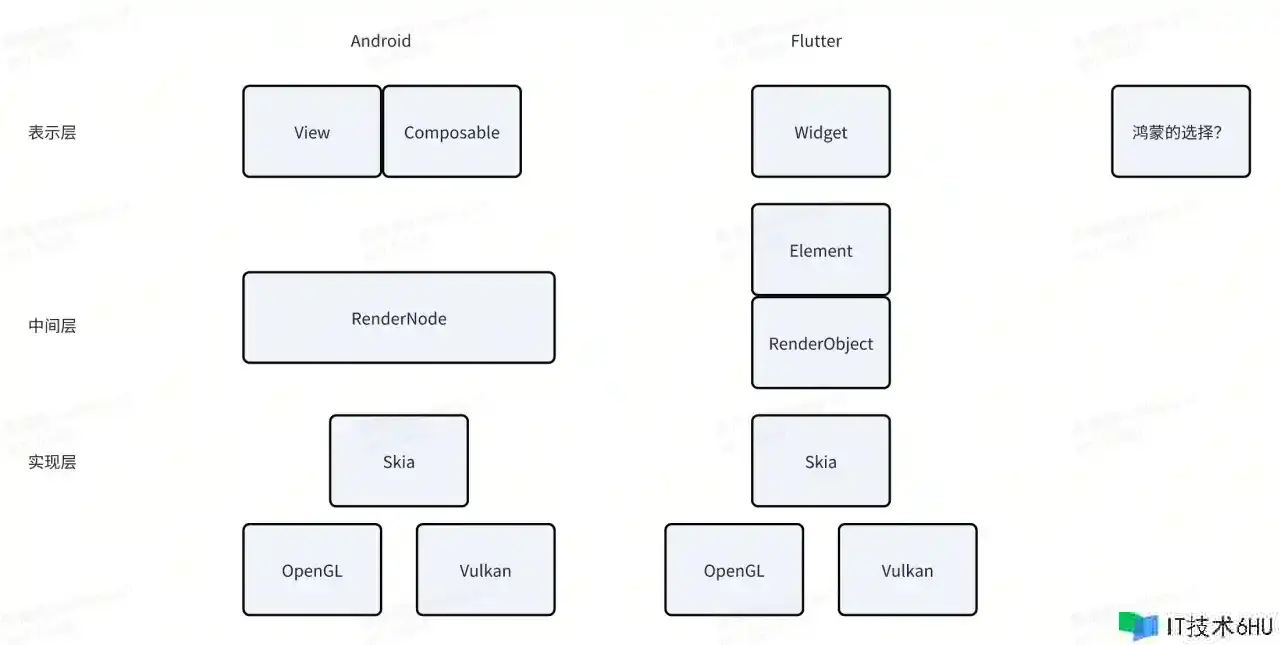 中心层:中心层,比方android 把View变成一个个RenderNode,用于进一步笼统,用于描绘Skia制作的命令等,其他UI结构比方Flutter也是,不同于Android的完结RenderNode,而是自己笼统一个个RenderObject,经过RenderObject生成Scene给到完结层(Flutter Engine)进行制作。