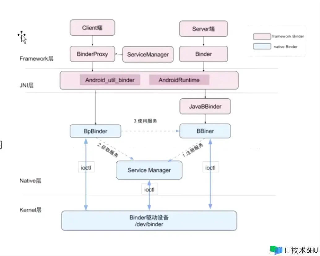4. Framework、Native 视点,Binder 衔接了 Client、Server、ServiceManager 和 Binder 驱动程序,形成一套 C/S 通讯架构;