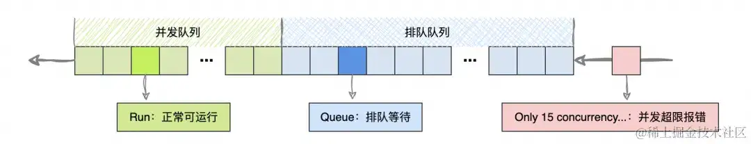 每个用户会装备 1 个并发行列和 1 个排队行列,当用户提交一条 SQL 时,会进行并发控制,若并发行列有空余,则直接运转;若并发行列满,则排队等候;若排队行列再满,则并发超限报错。