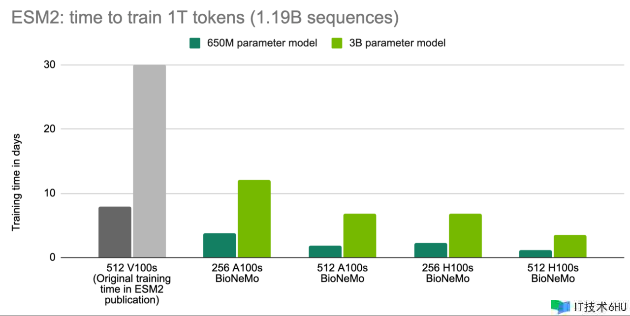 例如,ESM2 在 512 V100 GPU 上作为原始出版物的一部分进行练习,在 8 天内完成了 6.5 亿参数模型的练习,在 30 天内完成了 3B 参数模型的练习。现在,运用 BioNeMo 结构和 512 H100 GPU (运用 1T 令牌或 11.9 B 蛋白质序列进行练习)练习相同的模型,别离只需 1.2 天和 3.5 天。