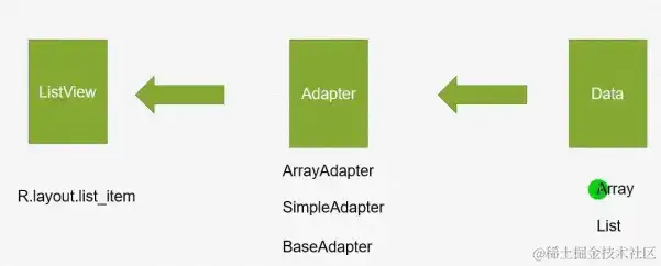 TextView、ImageView一样,一个控件对应一条数据; - 列表方式的数据,如何将多个布局与多个数据连接起来?中间就经过