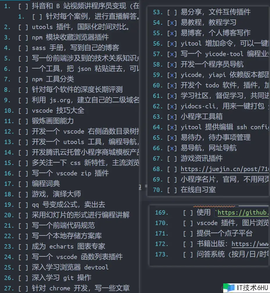 我有一个点子库,近 200个 构思和点子,是我平常灵感和主意的记录,其间 [x] 是现已完成的,还有许多点子完成了还没打钩。