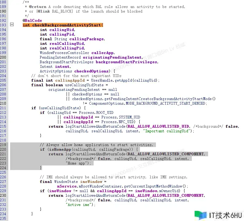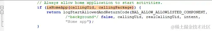 这儿应该是答应Home App能够发动Activity的,可是实际上咱们却没有在这儿return,而是在该办法的最终return了BAL_BLOCK,原因则可能是因为callingPackage(callingUid)和realCallingPackage(realCallingUid)不一致:
