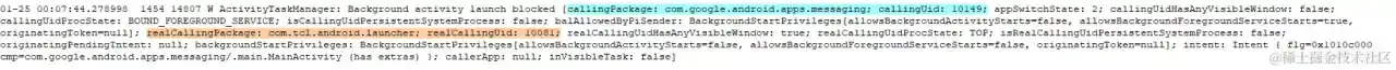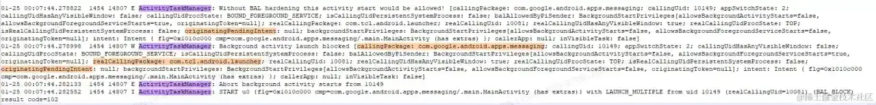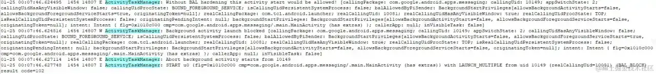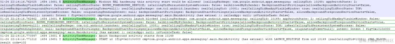 01-25 00:08:08.497936 1454 1636 I ActivityTaskManager: START u0 {flg=0x1010c000 cmp=com.google.android.apps.messaging/.main.MainActivity (has extras)} with LAUNCH_MULTIPLE from uid 10149 (realCallingUid=10081) (BAL_ALLOW_PENDING_INTENT) result code=0