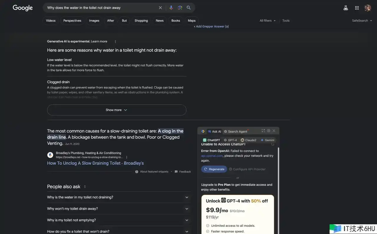 再举个例子。前几天,我在想为什么不管你冲刷多少次,马桶底部总能坚持适量的水。所以第一次我问了Google时,我问:why does the water in the toilet not drain away,下面是我得到的答案: