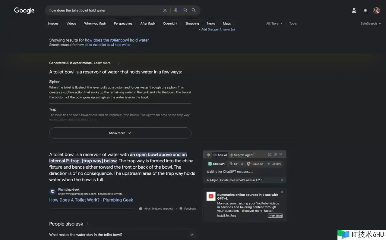 显然,Google以为我是在修理一个有问题的马桶,这绝对不是我想要的。所以我决议从头表达一下问题,再试一下,这次,我输入了how does the toliet bowl hold water,这次我得到了这样的答复: