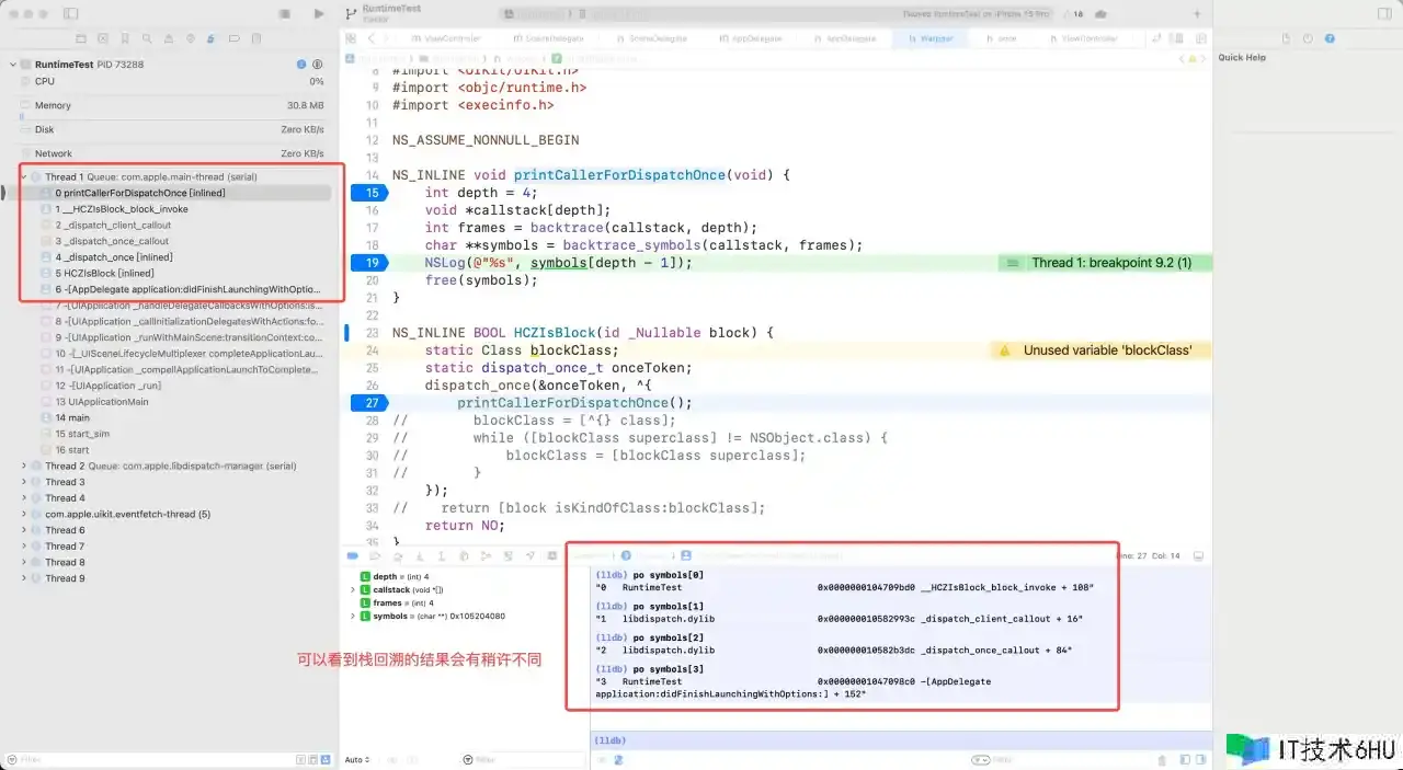 核算方法同上,能够看到,在 -[AppDelegate application:didFinishLaunchingWithOptions:] 办法里核算出的 HCZIsBlock.onceToken 地址变成了 0x104C65788,显着与 -[ViewController testFloat] / -[ViewController testVoid] 的不是一个。