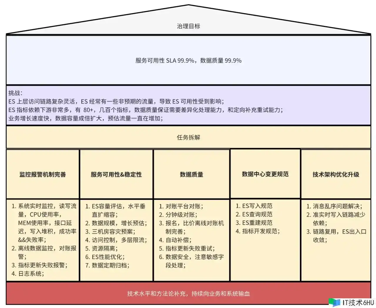 管理方针有两个,别离是体系的可用性、安稳性和数据质量, 体系可用性指的是安稳供给读写才能,数据质量即确保 ES 的数据和源数据完全共同,并且推迟符合事务预期,抵达不只有数据而且是有质量的数据规范。