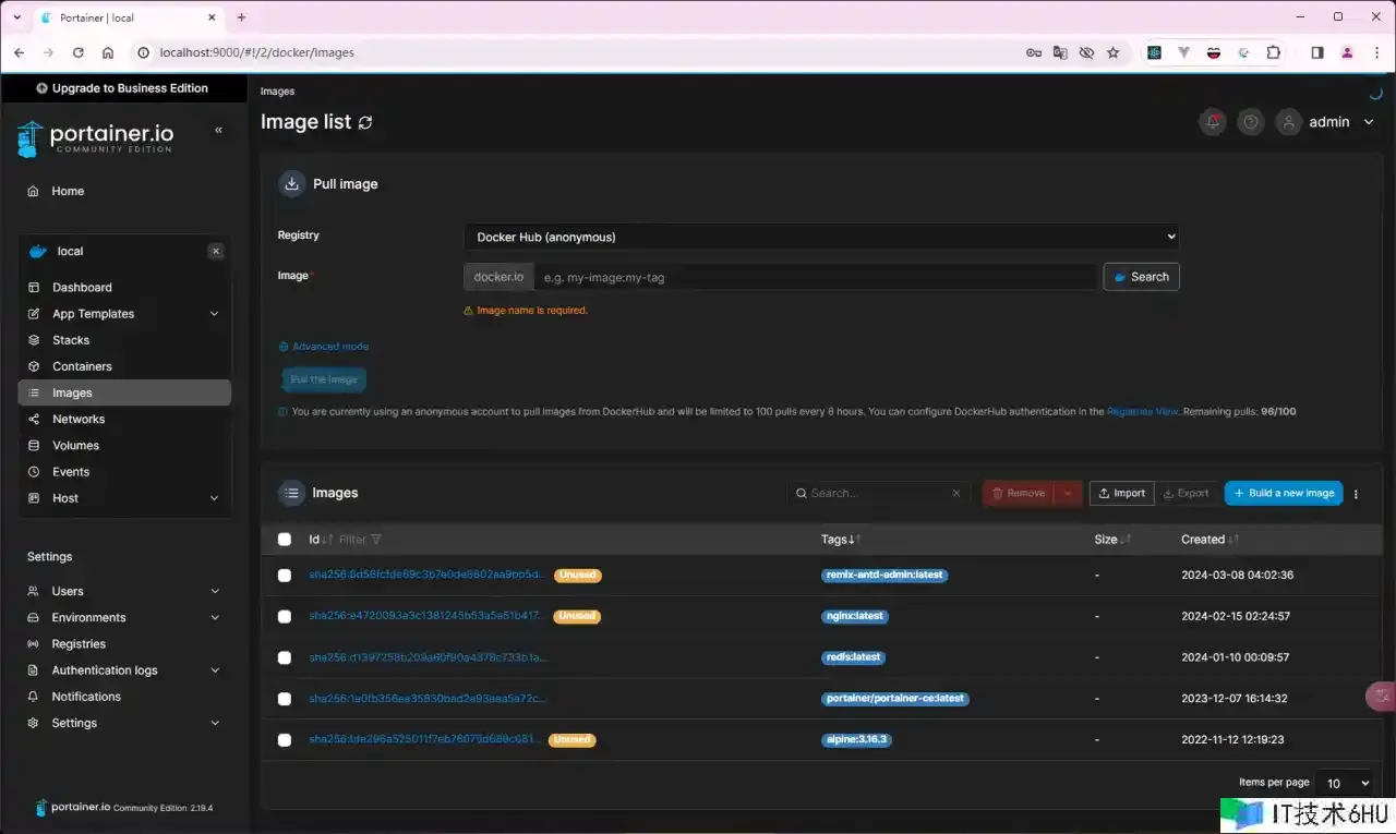 点击环境列表中的可以选列表,进入 docker 办理页面。进行容器镜像等操作。