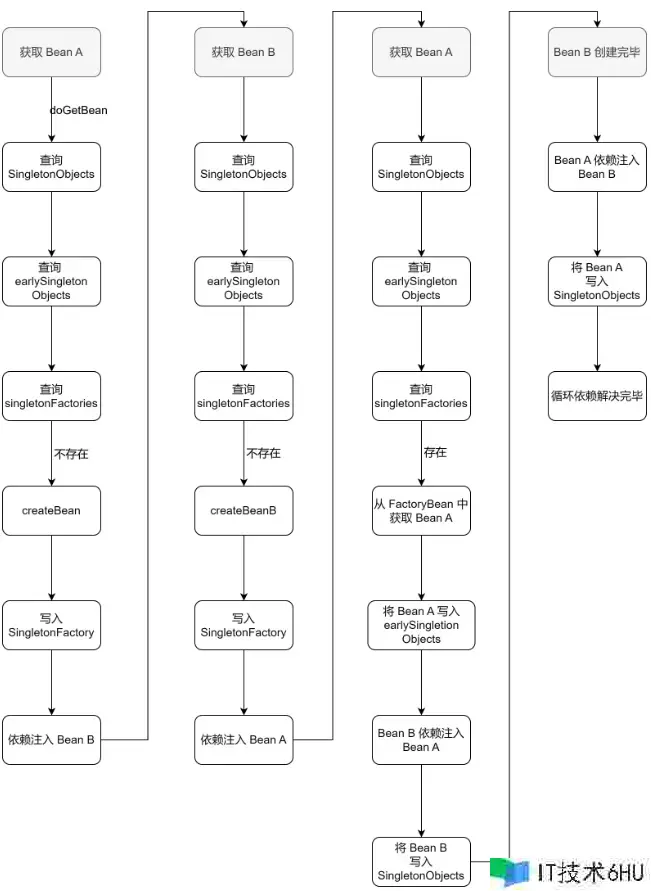 所以,三级缓存处理循环依靠的底子途径是:当 Bean 实例化后,先将自己存起来,假如其他 Bean 用到自己,就先从缓存中拿,不用去创立新的 Bean 了,也就不会发生循环依靠的问题了。过程如下图所示: