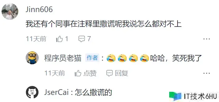 前段时刻老猫还遇到一个比较逗的小伙伴,他想表达的意思大概是“代码写的烂也就算了,他居然还在注释里说谎…”,结果他楼下哥们还在一个劲追问他的注释是怎样说谎的,老猫当时边吃午饭边在刷手机,老猫看到谈论后,笑到喷饭,当然在此也对这位小伙伴表示同情。