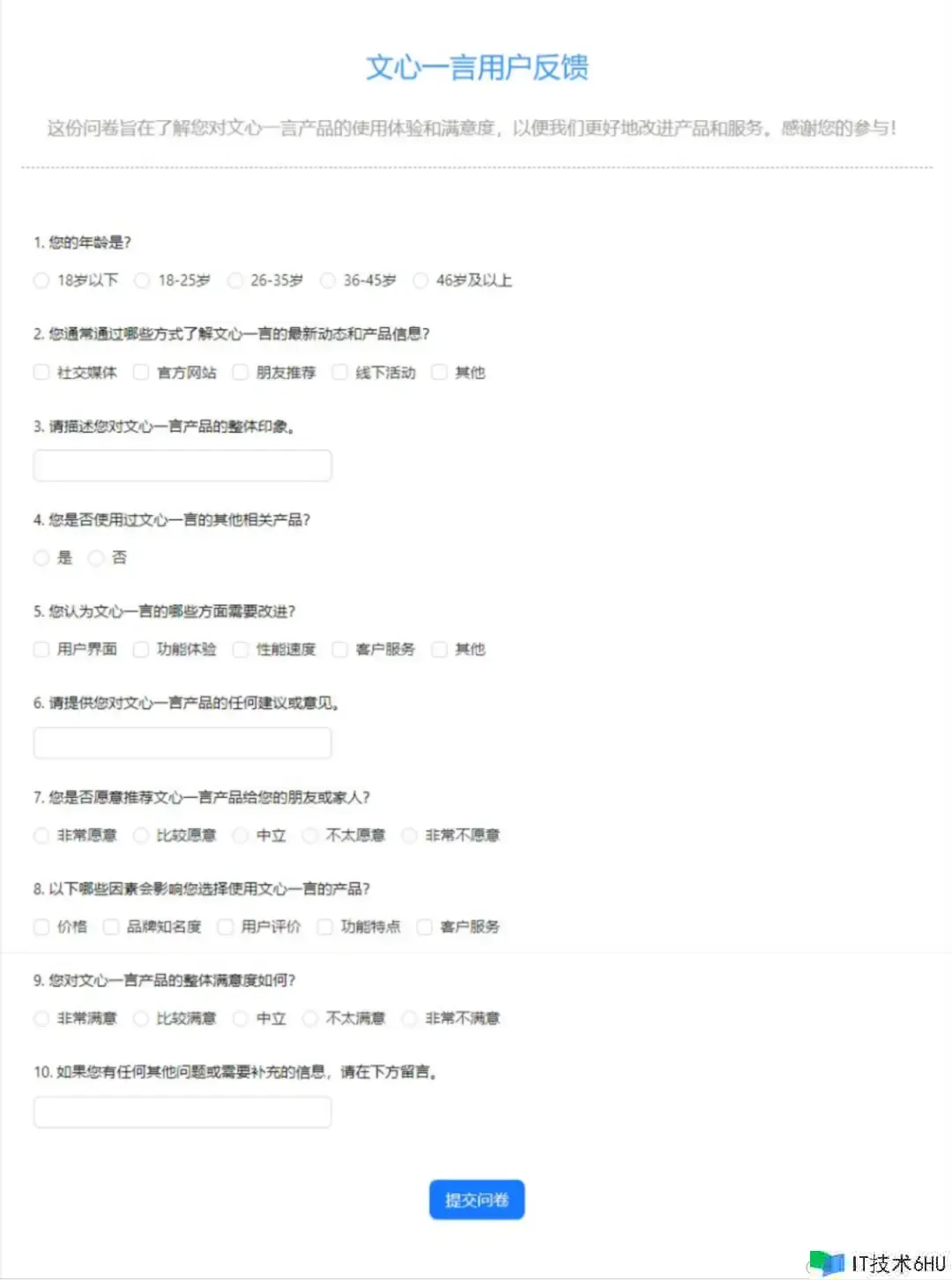 以文心一言用户反馈作为问卷的主题,生成一份包括10道题的问卷。