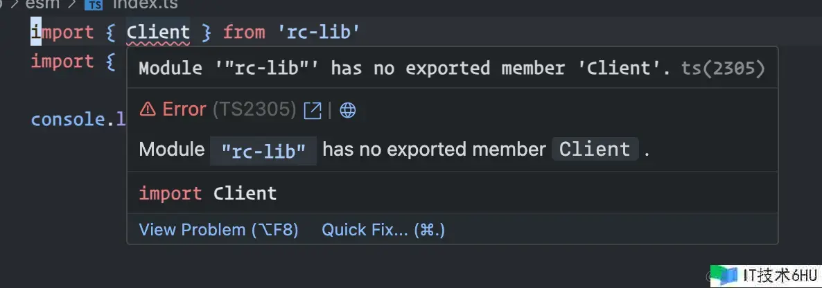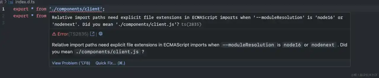 此刻运用 tsx index.ts,程序顺畅运转,并输出 true true。可见 node 关于这个 module 的 resolve 是没有问题的。但是问题出在了 TypeScript 的类型推导。