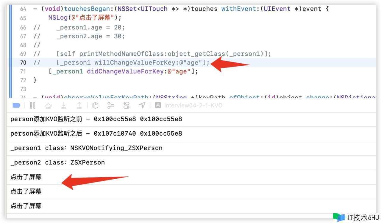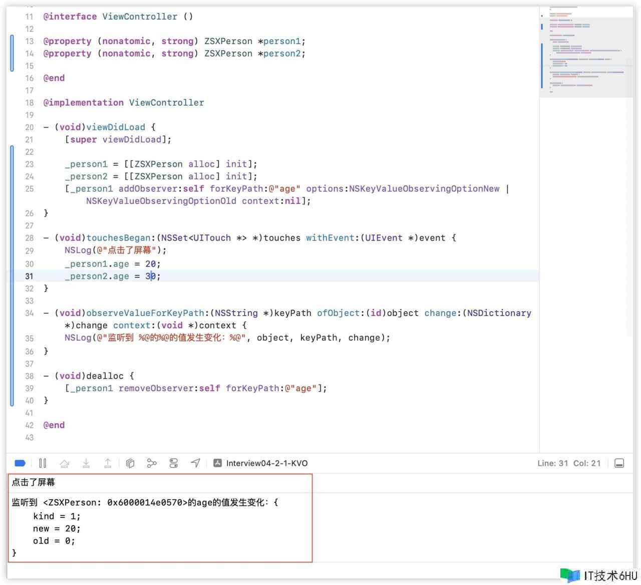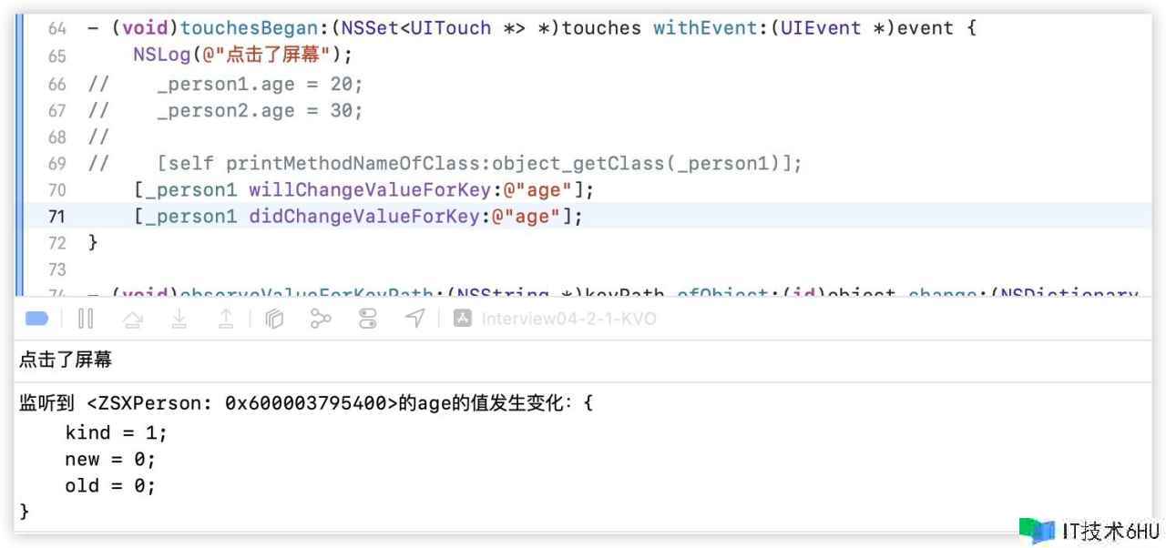• viewController 中创立ZSXPerson特点并初始化,然后增加KVO监听实例目标的age改变,接着通过 touchesBegan 点击屏幕的时分修正age值,来触发 KVO