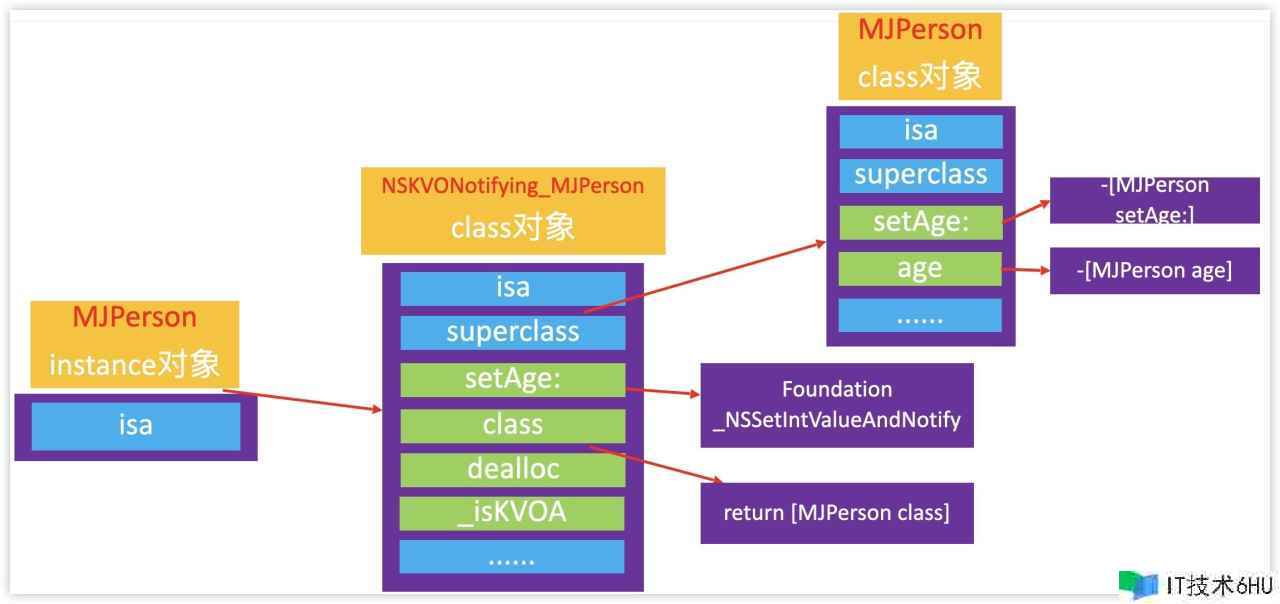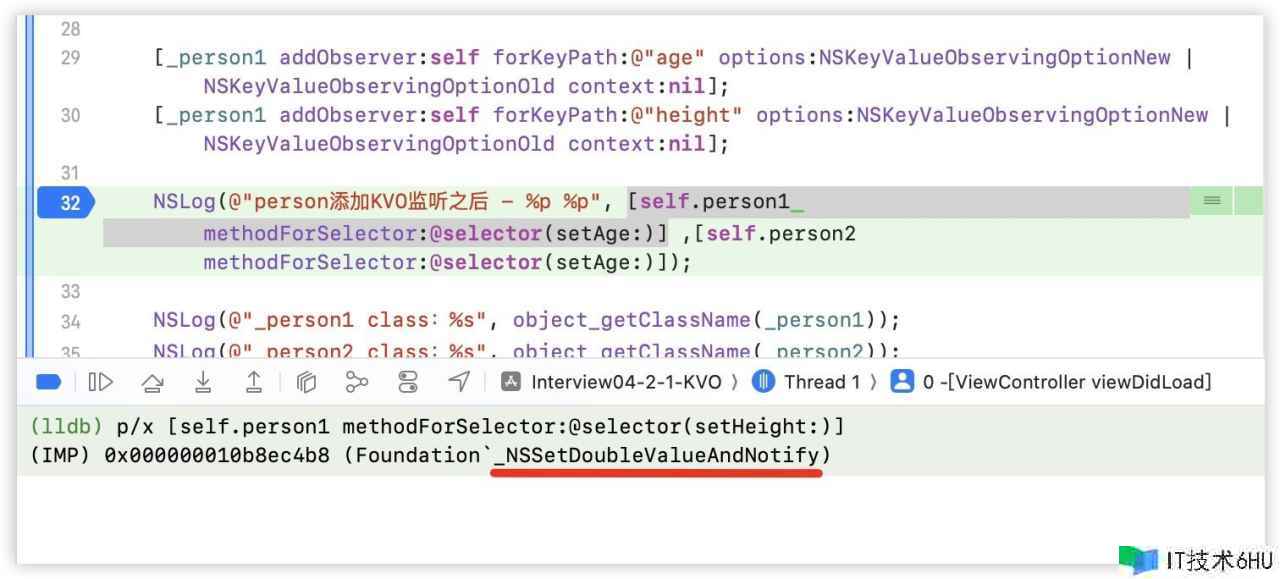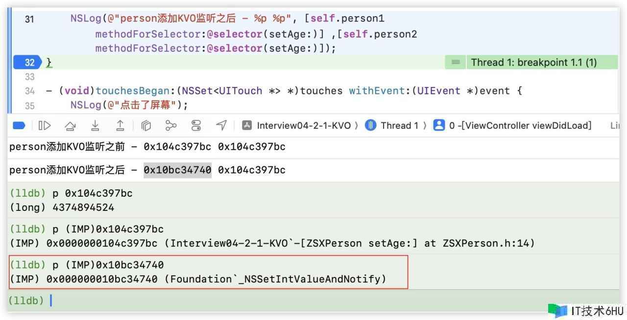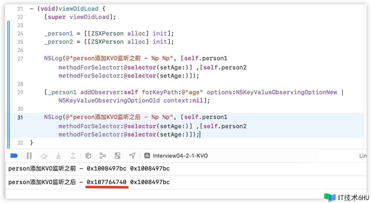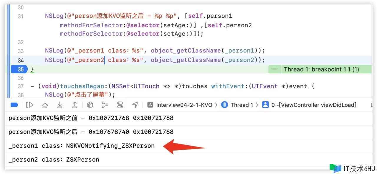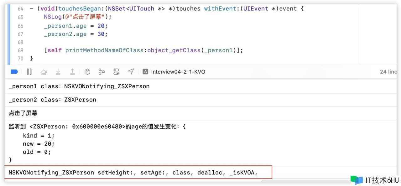 发现person1 的 setAge 办法在增加完 KVO 监听后改变了,person2 是没有改变的