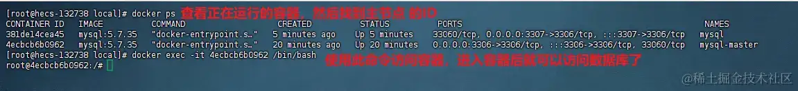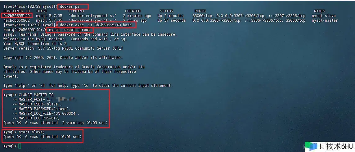 如上相同,进入到从节点容器的mysql中。履行以下指令
