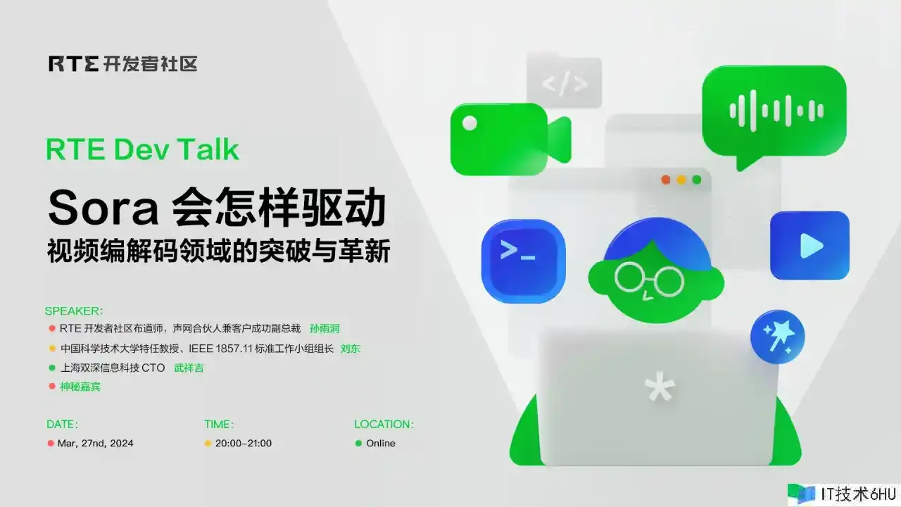 本期 RTE Dev Talk,咱们约请到了 IEEE 1857.11 规范工作小组组长 刘东教授 在线分享“端到端图画编码技能与规范”,以及双深科技 CTO 武祥吉教师,声网合伙人、VP 孙雨润等大佬深入剖析 Sora 技能在压缩算法、实时传输和跨平台兼容性方面的创新,以及这些技能是如何改动现有的视频编解码技能,以及影响未来的视频工业开展。