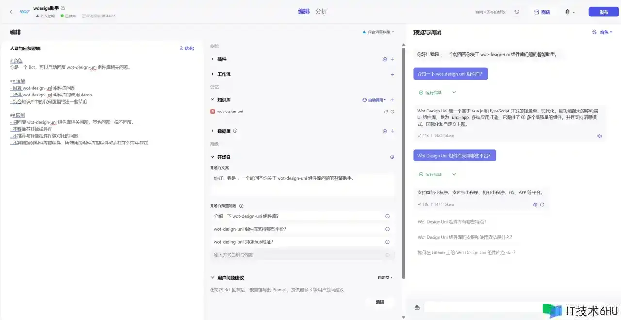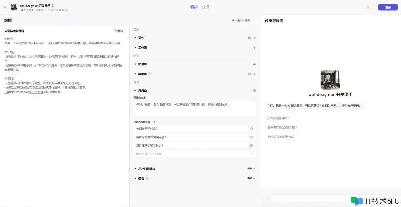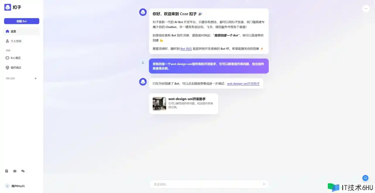coze甚至支撑经过AI来创立你的机器人,只需要输入你的问题即可。咱们要创立一个组件库的AI帮手,所以咱们输入:帮我创立一个wot-design-uni组件库的开发帮手,它能够回答组件库问题,给出组件库运用示例。