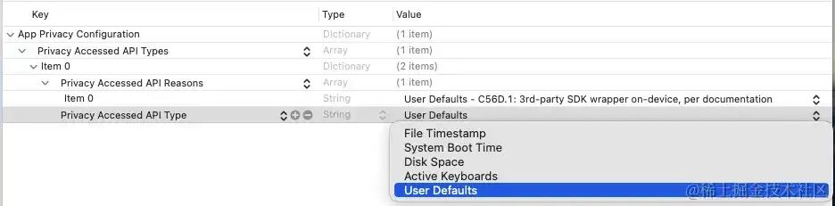 以下用于拜访用户默许值的 API 需求运用原因。运用该字符串作为字典中键的值。NSPrivacyAccessedAPICategoryUserDefaults``NSPrivacyAccessedAPIType``NSPrivacyAccessedAPITypes