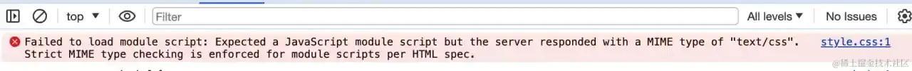 当然,前提是这个JS是要被Vite或Webpack等打包工具处理的,假如在HTML里直接引进,尽管网络里下载到了这个CSS文件,但浏览器校验它不是JavaScript,仍是要报错的。