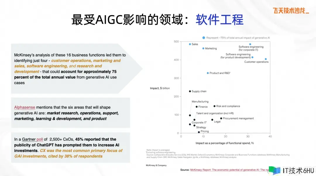 这张图是麦肯锡最近发布的一个研究陈述,咱们能够看到他把软件工程列在了整张表格的右上角,也便是影响最大、影响速度最快的一部分。他为什么会有这样的观念?这是由于在大模型年代,咱们发现大模型在代码生成和全体的逻辑推理方面是特别拿手的,所以出现出了相似 Github Copilot 这种十分有代表性的智能编码东西,能够瞬间提高许多企业开发工程师的研制功率,并且 Copilot 是至今为止在国际范围内商业化最成功的大模型的范畴之一。